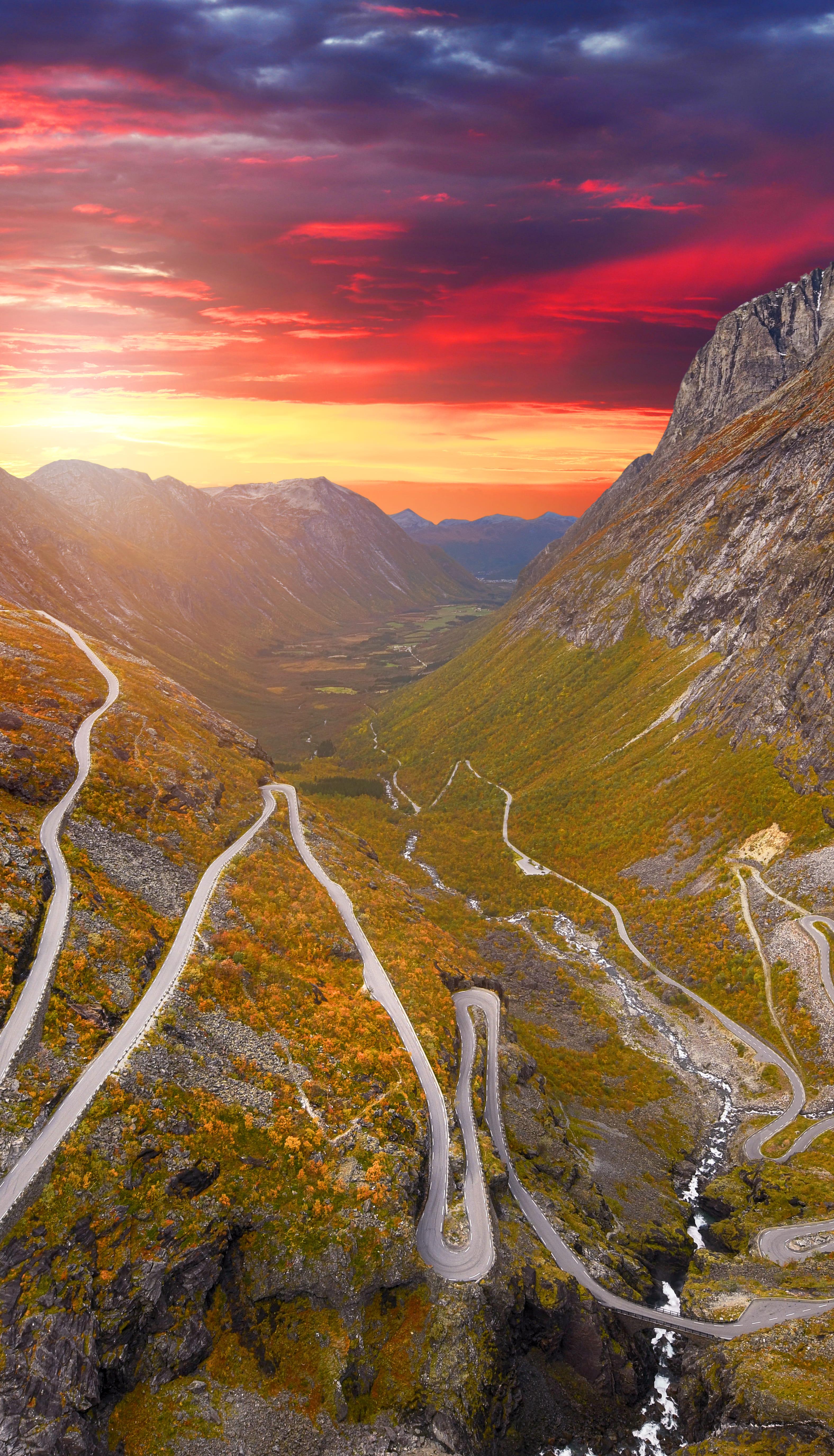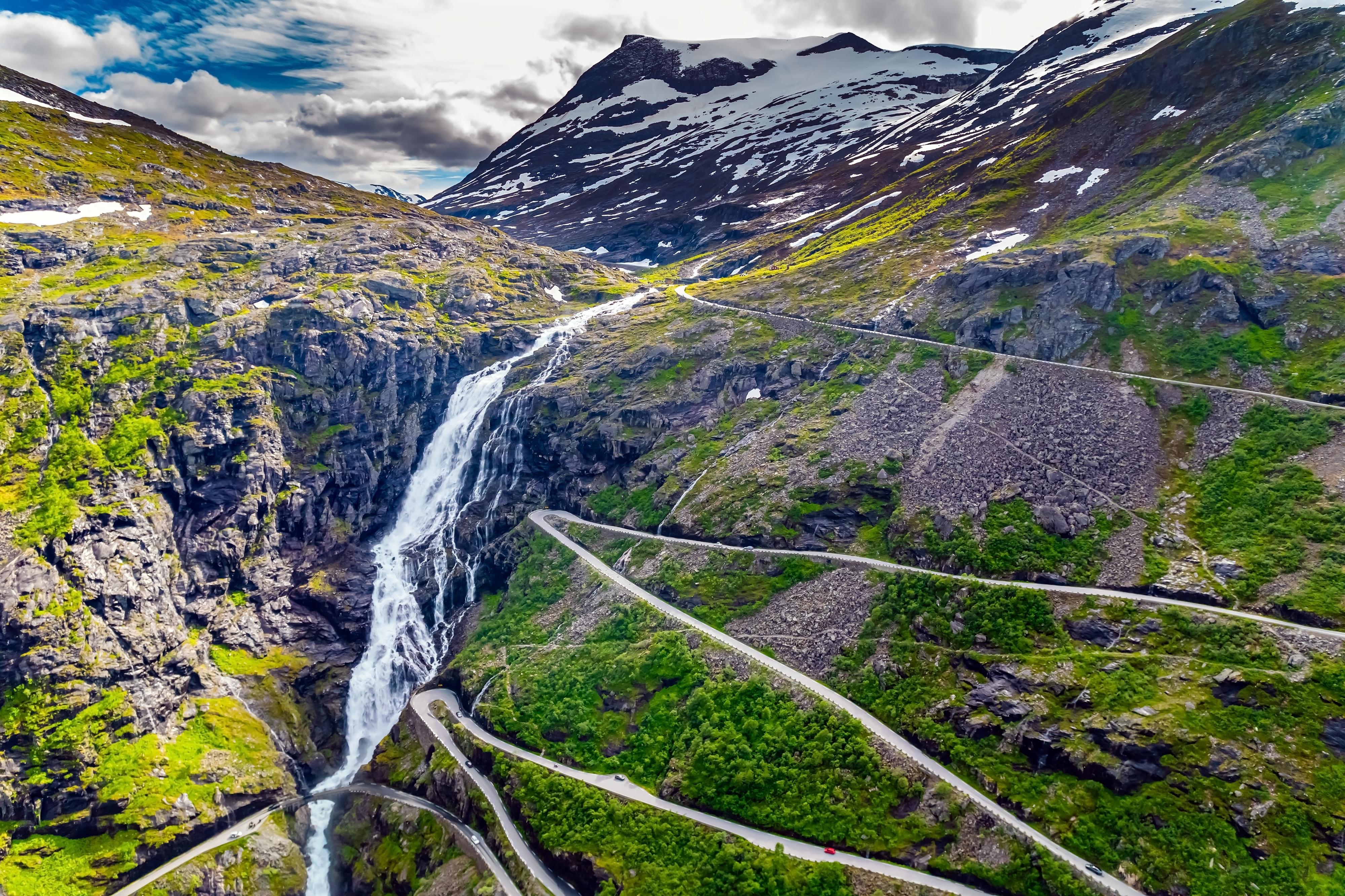 Auf halber Strecke etwa befindet sich der Wasserfall "Stigfossen", der sich 320 Meter tief unter einer Bogenbrücke hinabstürzt. Ganz oben an der Straße befindet sich ein Aussichtspunkt, der den Blick auf Straße, Tal und Berge freigibt.