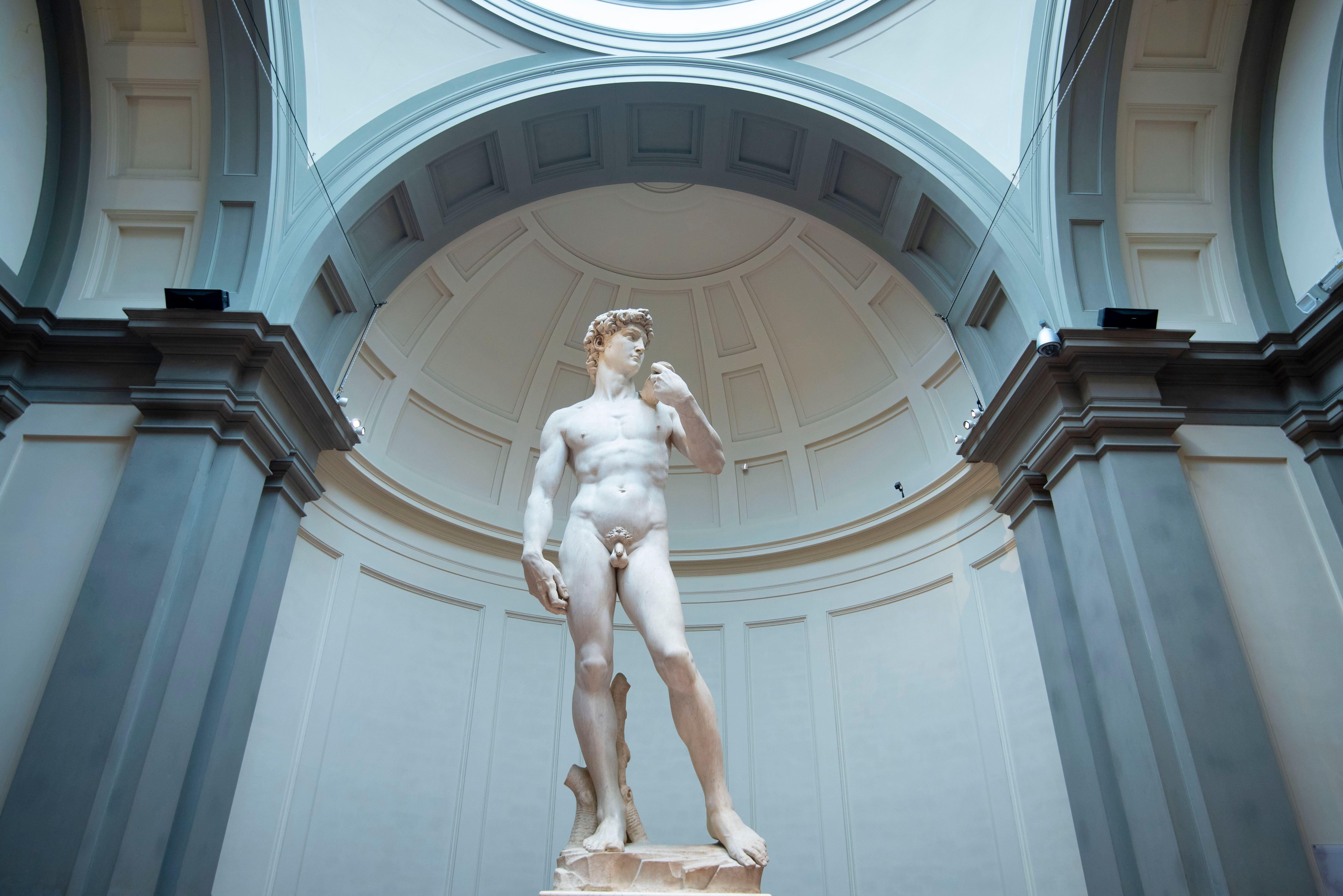 Aus der Nähe betrachtet ist nicht zu übersehen, dass der Kopf und die Hände des nackten Jünglings unverhältnismäßig groß sind, während sein Geschlecht eher klein wirkt. Das kommt nicht von ungefähr. Die 5,20 Meter große Skulptur sollte ursprünglich hoch oben auf einem Strebepfeiler in der Apsis der Kathedrale stehen. Von unten betrachtet wären Kopf und Hände in perfekter Proportion zu sehen gewesen. Warum jedoch der kleine Penis? In der klassischen Kunst galt ein großes oder sogar normal großes Geschlecht nicht als elegant, daher die zierliche Darstellung. Michelangelos unvollendete Prigioni, die Gefangenen aus den Jahren um 1523, sind weitere Aktdarstellungen, die eine Betrachtung wert sind.