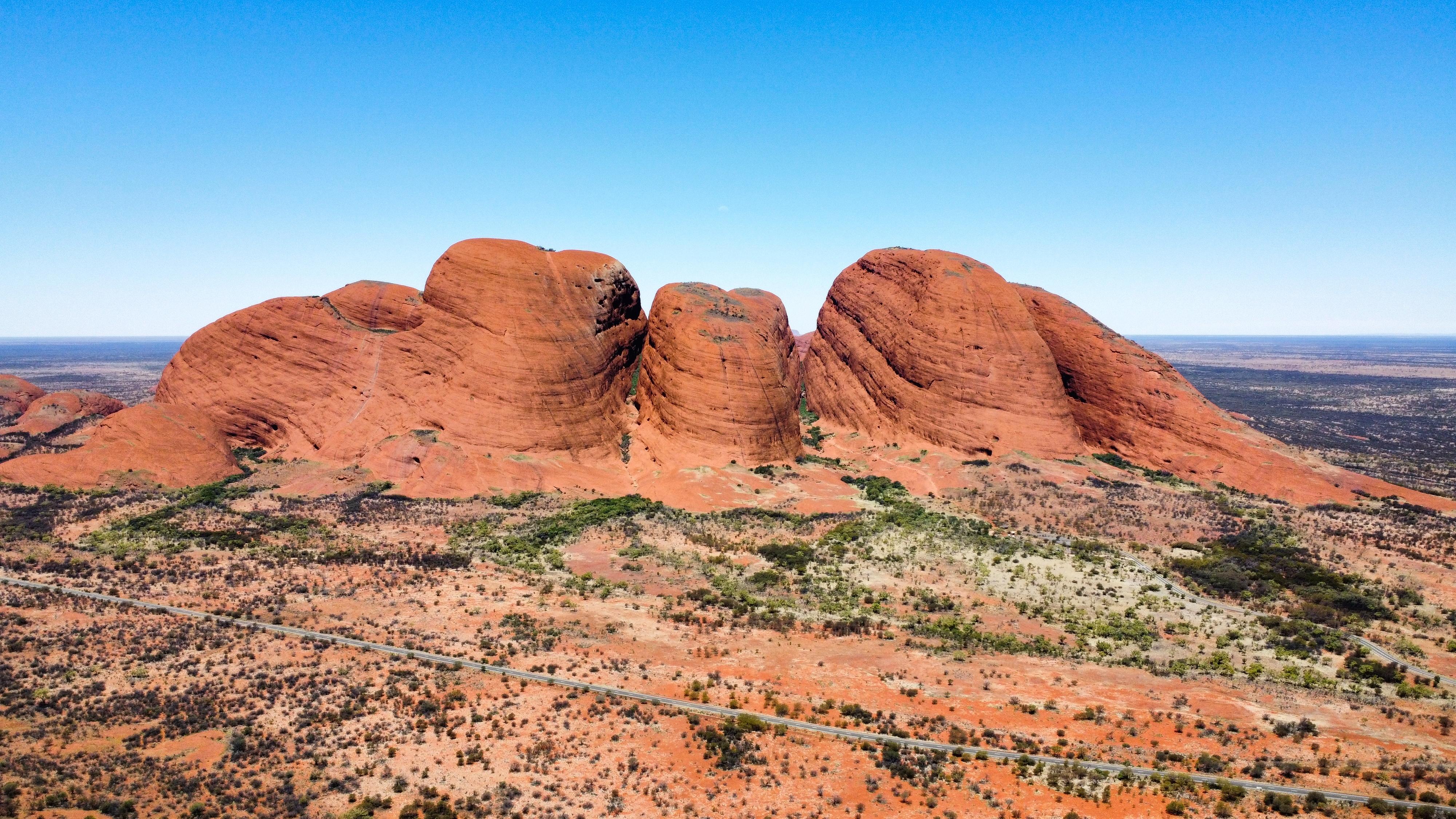 Etwa 30 km vom berühmtesten Felsen im Nationalpark Uluru-Kata Tjuta entfernt liegen die 36 markanten roten Kuppeln von Kata Tjuta (The Olgas), die auf jeden Fall eine Reise wert sind.Kata Tjuta bedeutet "viele Köpfe" und ist für die Tjukurpa (die auch "Traumzeit" genannte Mythologie und Weltanschauung der Aborigines) von großer Bedeutung.