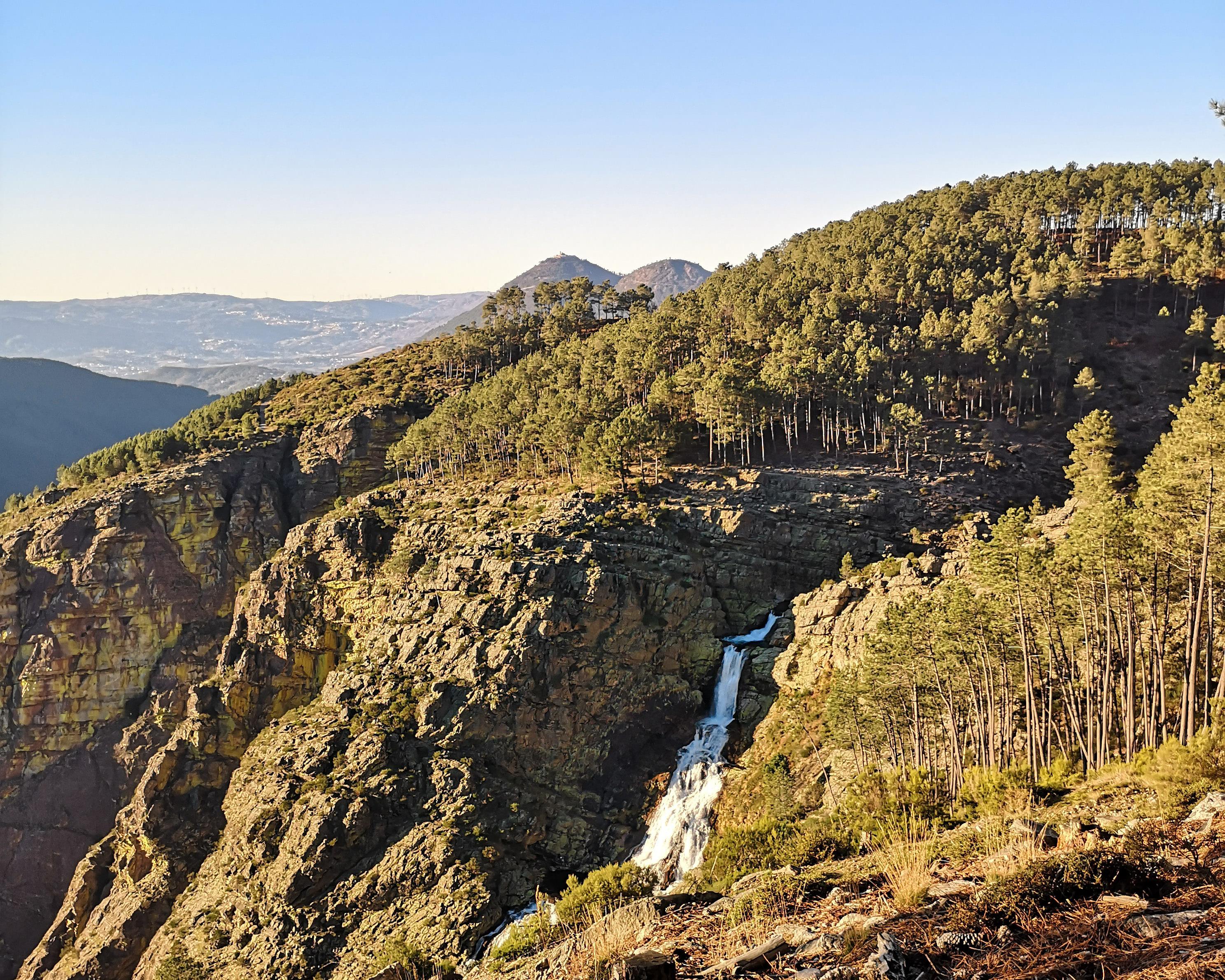 Wer die Wasserfälle von oben sehen möchte, kehrt zur Hauptstraße zurück und fährt weiter zu einem Schild mit der Aufschrift "Varzigueto". Der Straße nach Varzigueto ein kurzes Stück folgend, befinden sich bald auf der rechten Seite zwei unbefestigte Straßen mit der Aufschrift "Piocas de Cima". Die erste mit der Aufschrift "1,5 km" ist angenehmer zu fahren als die zweite mit der Aufschrift "600 m". Auf beiden Straßen gelangt man schließlich zu einem Fußweg, der in die Flussschlucht führt. Von dort aus bietet sich ein fantastischer Ausblick auf den reißenden Fluss, der von einer steilen Felswand herabfällt. Weiter oben befinden sich eine natürliche Wasserrutsche und eine Reihe von Felsenpools - perfekt zum Abkühlen an einem heißen Tag.