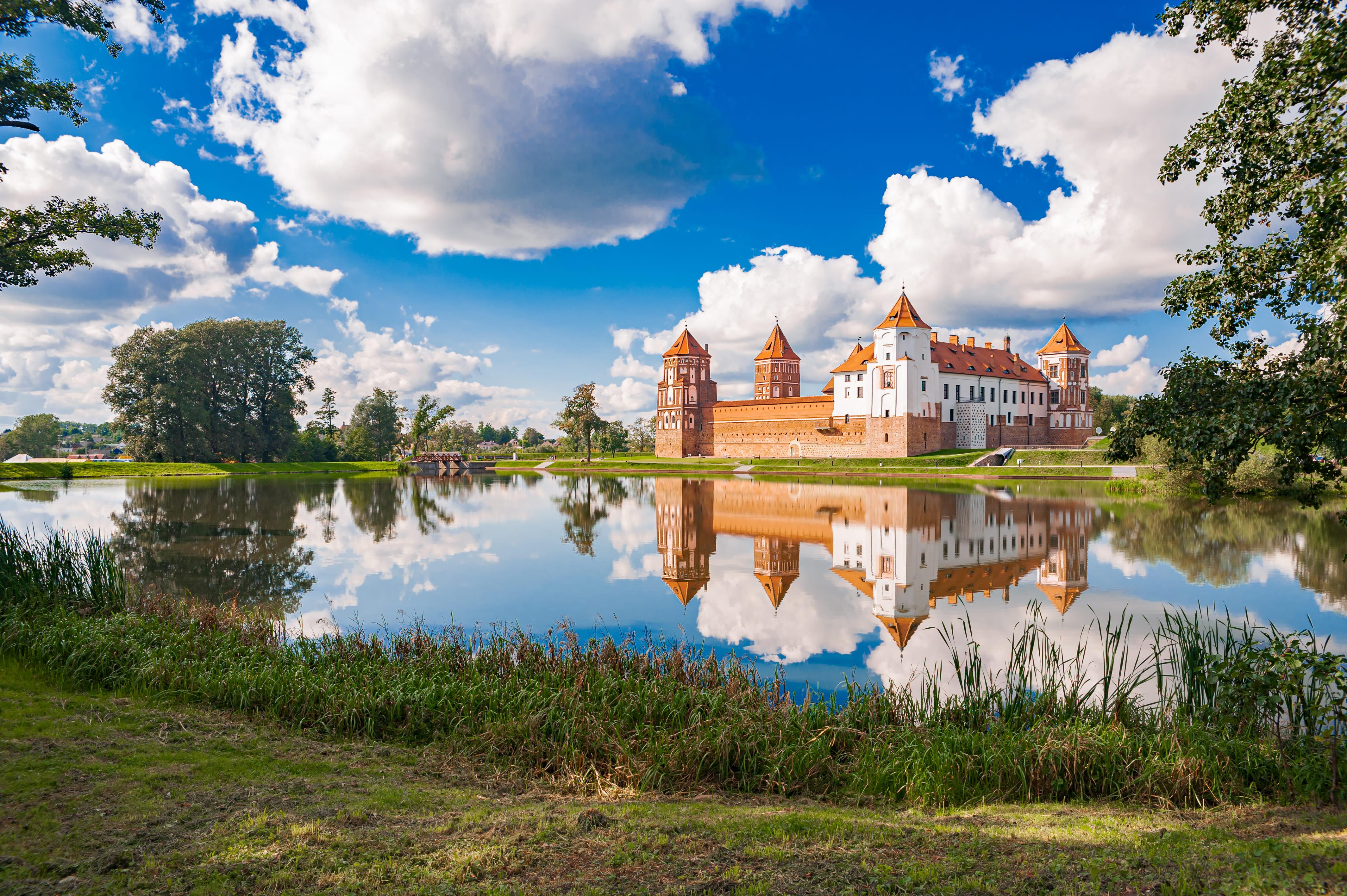 Fünf eckige Türme beherrschen das Bild von Schloss Mir nahe der gleichnamigen Stadt in Weißrussland. Das Gebäude vereint in sich Gotik-, Barock- und Renaissance-Stilelemente. Ursprünglich Ende des 15. Jahrhunderts als Festung angelegt, putzten es Adlige bald als Schloss heraus. Ein wehrhaftes Aussehen behielt es dennoch.