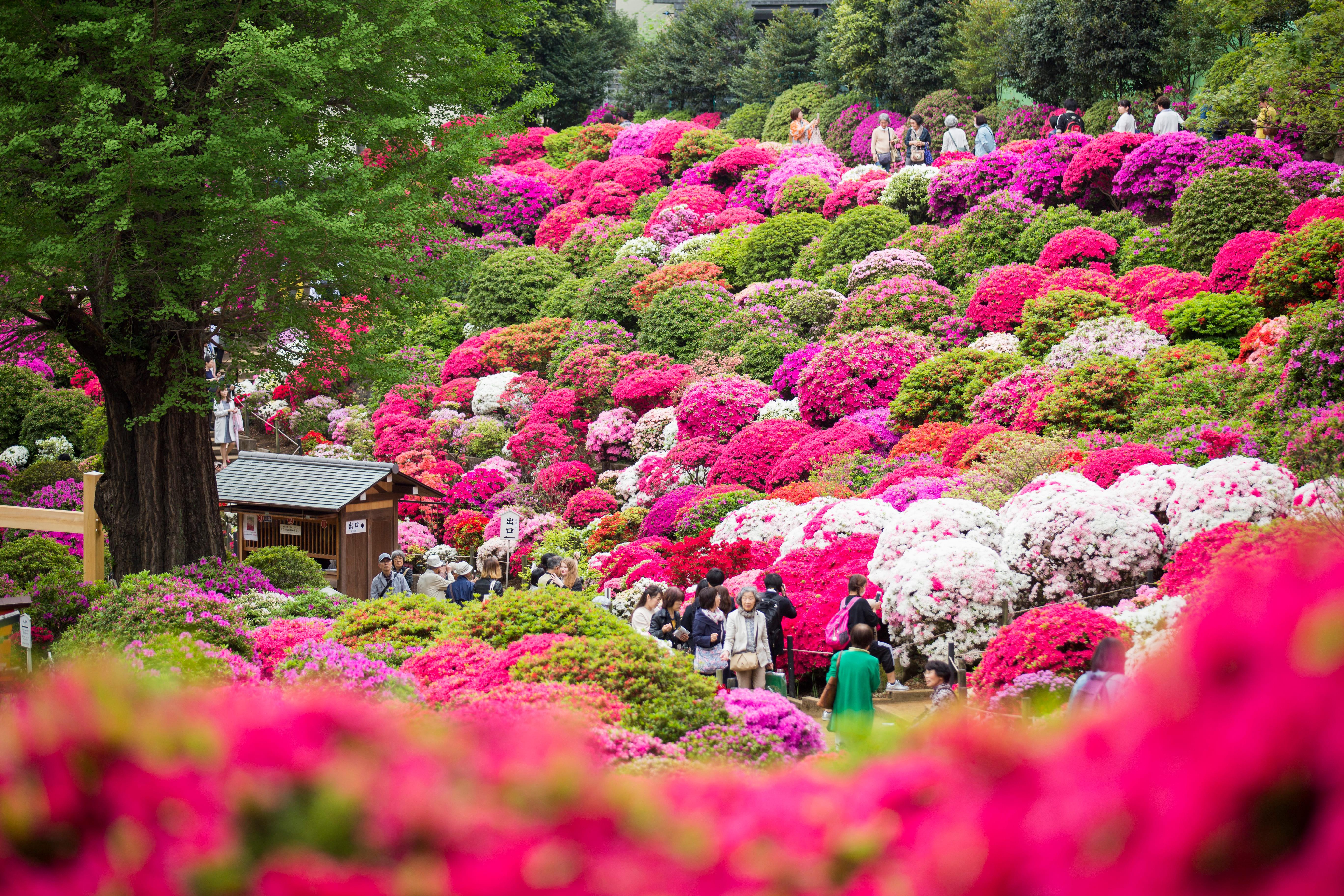 Bald nachdem die letzten Kirschen verblüht sind, erscheinen die kühnen, hellen Azaleenblüten (Tsutsuji), die in der Gunst der Frühlingsliebhaber ebenfalls weit oben rangieren. Dem genauen Beobachter wird möglicherweise auch die feine saisonale Veränderung der Kimono-Muster auffallen. Ab der zweiten Aprilwoche bis zur ersten Maiwoche dominiert das üppig-dekorative Buschwerk der blühenden Azaleen das Stadtbild. Der beliebteste Ort, um sie zu bewundern, ist der Shinto-Schrein Nezu-jinja, wo sich ein berühmter Azaleengarten mit rund 3.000 Sträuchern befindet, die über hundert Sorten Blüten tragen.