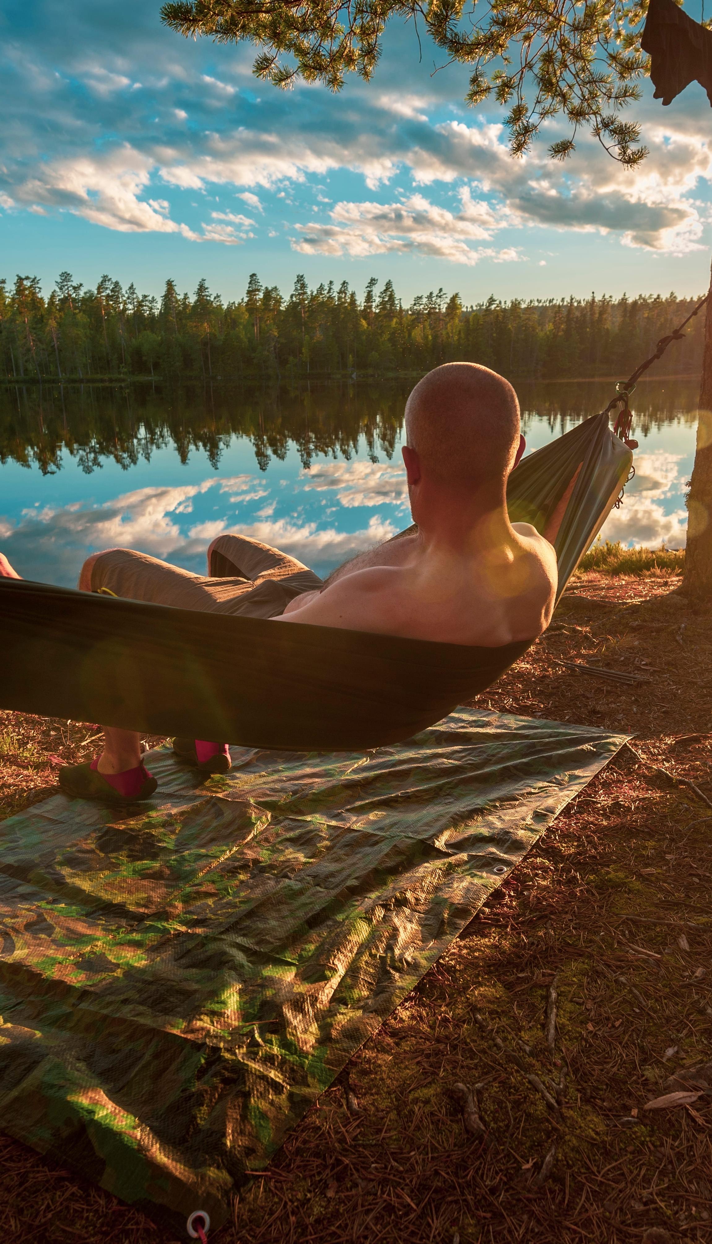 Nachdem wir unser Zelt aufgebaut haben, beschließen wir, zu Fuß die Insel zu erkunden, und danach wird es Zeit, ein Feuer zu machen. Eine leichte Aufgabe mit dem Holz und der Anzündflüssigkeit aus dem Paket. Es ist auch eine Schaufel vorhanden, um ein Loch zu graben – unsere Toilette während des Aufenthalts auf der Insel. Das Abendessen, bestehend aus frischem Lachs, Kartoffeln und Gemüse in Aluminiumpäckchen, legen wir zum Garen auf einen Rost über dem Feuer und danach ist Zeit zum Entspannen angesagt mit einem leckeren lokalen Bier in der Hand. Langsam bricht die Dämmerung herein und die letzten Boote verschwinden vom See. Das Knistern des Lagerfeuers und das Rascheln des Windes in den Bäumen ist alles, was wir noch hören. Als das Feuer gelöscht ist und die Sterne am Himmel erscheinen, wird es Zeit, ins Zelt zu kriechen.