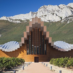 Der von Frank Gehry errichtete visionäre Hotelbau im beschaulichen Elciego besticht schon rein äußerlich mit seinen wild geschwungenen, bunten Titan-Bögen. Auch das Innenleben mit dem Sternerestaurant ist ein Erlebnis. Rund acht Millionen Flaschen lagern in der Dorfkellerei, die unterirdisch mit dem Hotel verbunden ist (90-minütige Weintour inkl. Tastings ab ca. 10,25 €, marquesderiscal.com).