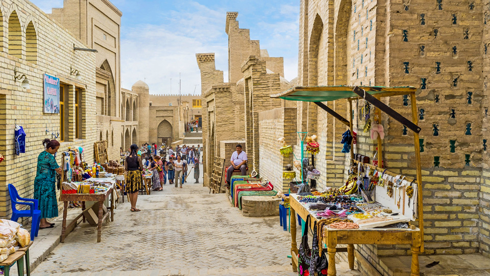 Alle Städte Usbekistans haben unglaubliche Basare. Keiner jedoch versetzt seine Besucher derart zurück in die glanzvolle Zeit, als endlos lange Karawanen von Händlern vorbei zogen und ihre Waren anboten, wie der Basar von Buchara. Ein Netzwerk von miteinander verbundenen, gewölbeförmig überdachten Marktplätzen dominiert immer noch die Altstadt. Die eindrucksvollsten davon sind der Taki-Sarrafon (Geldwechsler-Basar), der Taki-Telpak Furushon (Hutmacher-Basar) und der Taki-Zargaron (Juwelier-Basar).
