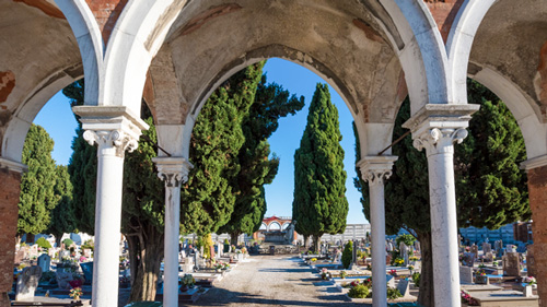 Die Lagunenstadt Venedig hat eigene Herausforderungen, was den Friedhof angeht. Zum einen Platzmangel, zum anderen das Wasser. Darum haben die Venezianer ihre Toten auf eine eigene Insel gelegt, auf San Michele. Das Eiland misst nur 460 mal 390 Meter, ist komplett umgeben von einer roten Ziegelsteinmauer. Hin kommt man nur per Boot - ganz gleich, ob tot oder lebendig.