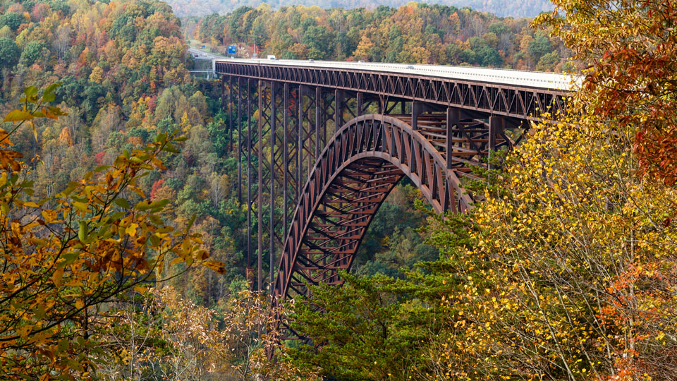 Von der US 19 führt eine Ausfahrt in südlicher Richtung zum Canyon Rim Visitor Center, das zum staatlich verwalteten New River Gorge Nationalpark gehört. Über einen Pfad hinter dem Besucherzentrum gelangst du zu einem von Bäumen eingerahmten Aussichtspunkt auf die 267 Meter hohe New River Gorge Bridge, die dritthöchste Stahlbrücke der Welt. Während des Bridge Day Festival am dritten Samstag im Oktober dürfen BASE-Jumper von dieser Brücke springen.